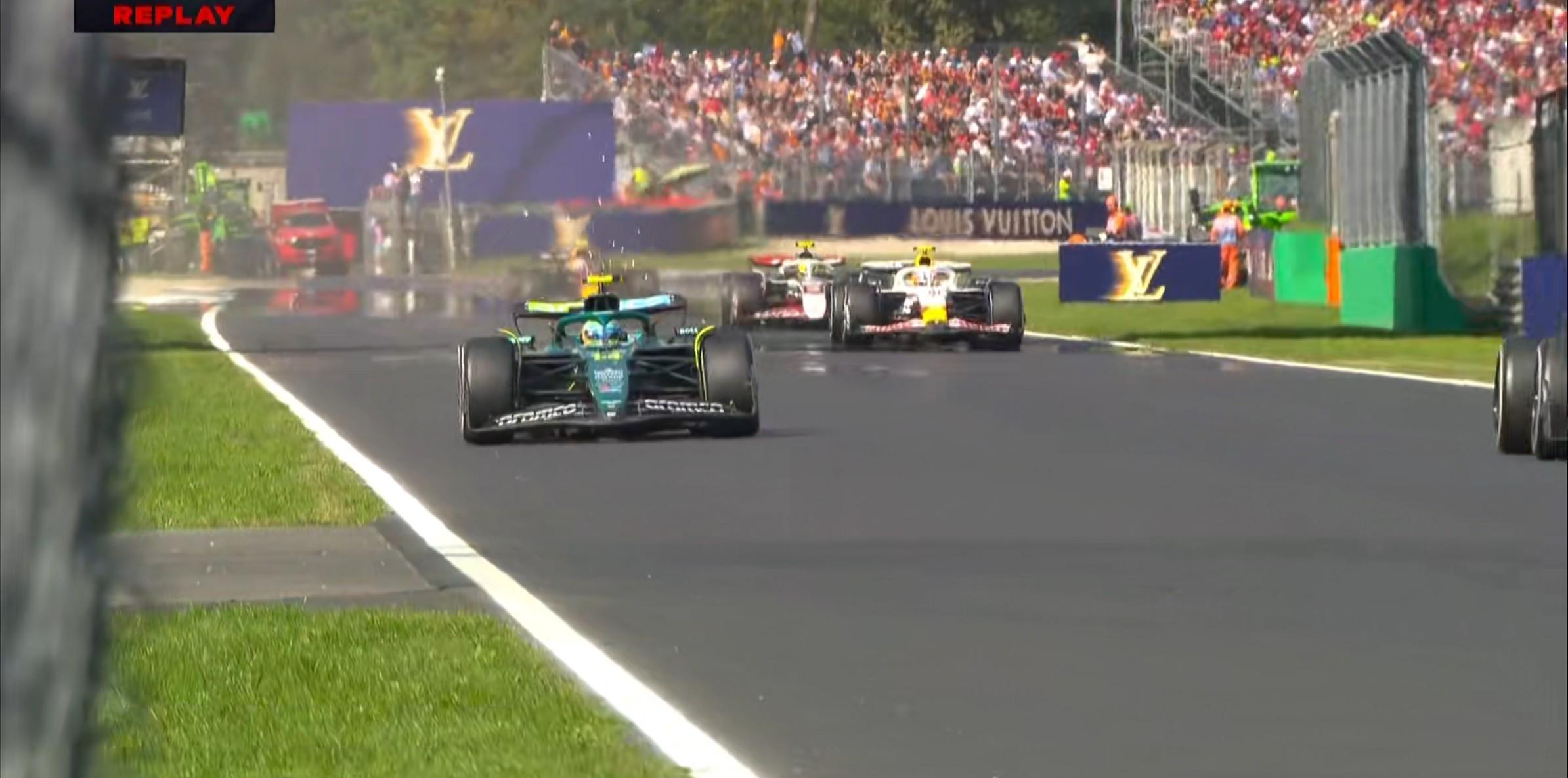 回放显示,阿隆索在阿斯卡里弯略微走大,赛车的右前悬挂被颠断;