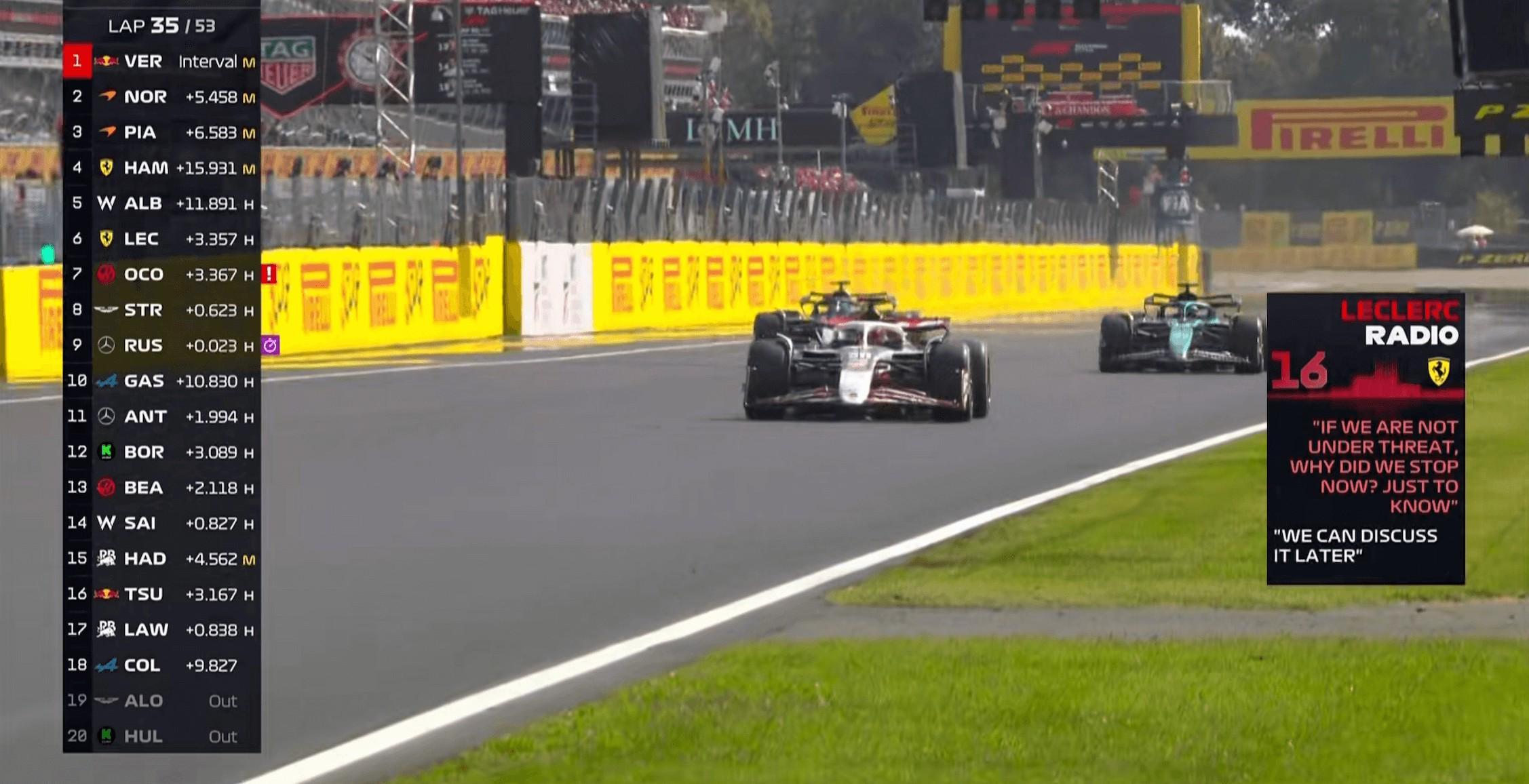 第35圈:勒克莱尔对车队的进站提出质疑,工程师回复稍晚再议...