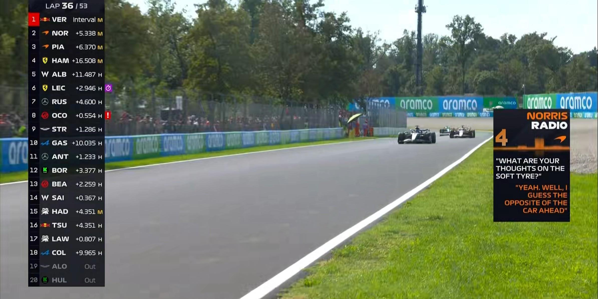 第36圈:工程师询问诺里斯软胎的意见,后者表示自己想要和前方的赛车采取相反的策略;