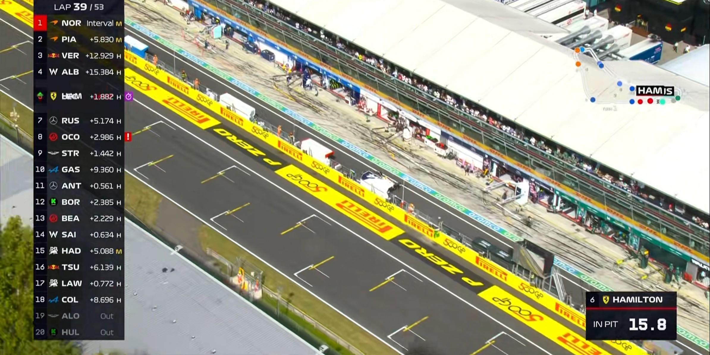 第49圈:车队告知皮亚斯特里目前的情况与去年的匈牙利站很相似,车队的原因导致出现了这样的情况,因此车队要求皮亚斯特里在1号弯前放过诺里斯!