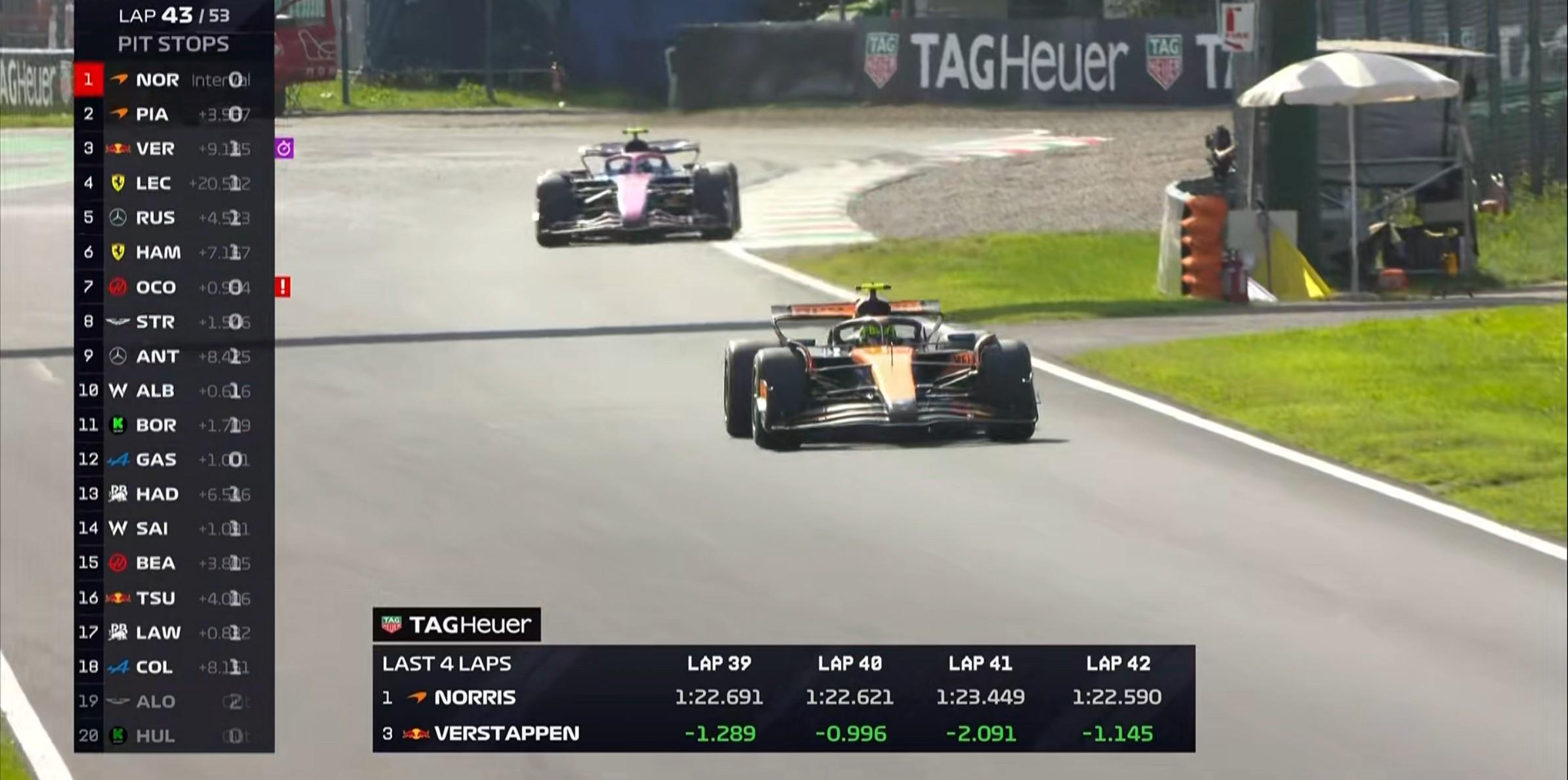 第43圈:两台迈凯伦尚未完成一停,维斯塔潘快速追近皮亚斯特里&诺里斯;