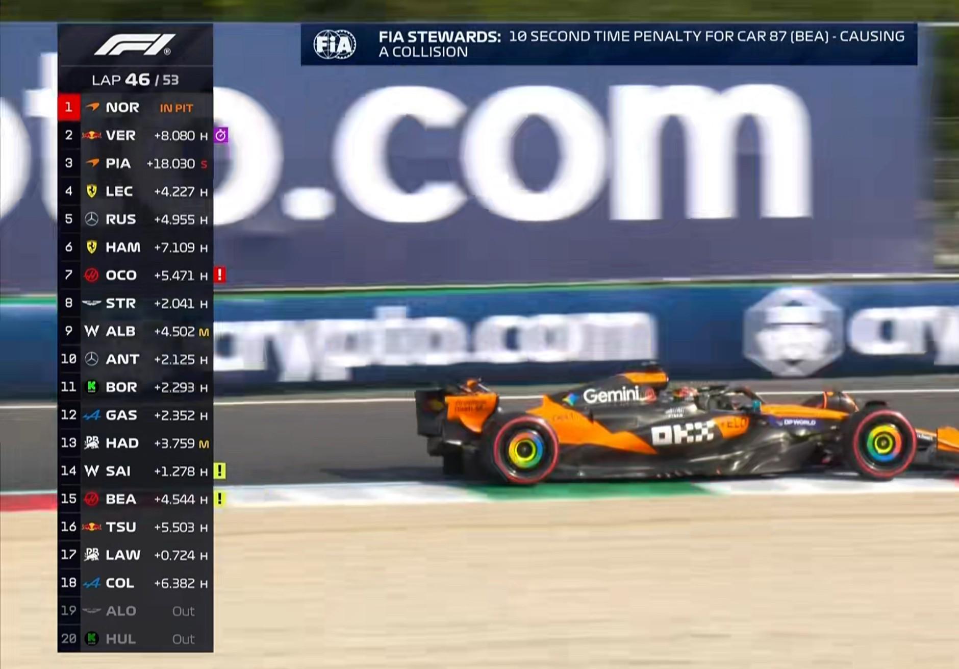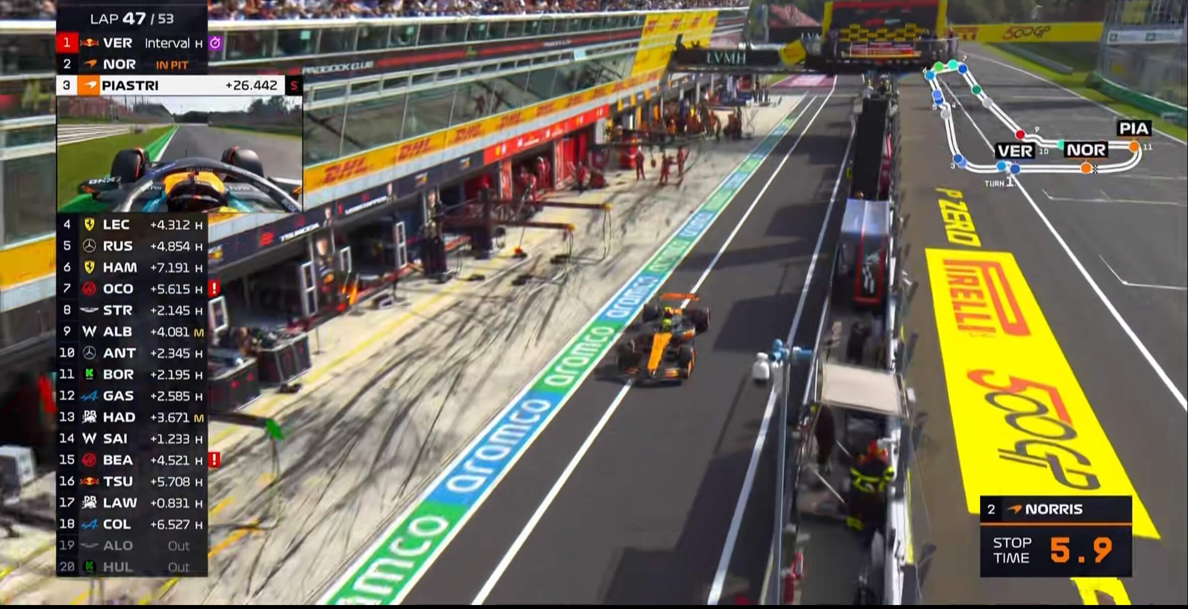 第47圈:诺里斯遭遇车队5.9秒换胎,他也因此被皮亚斯特里undercut,但车队向诺里斯保障不会有undercut!
