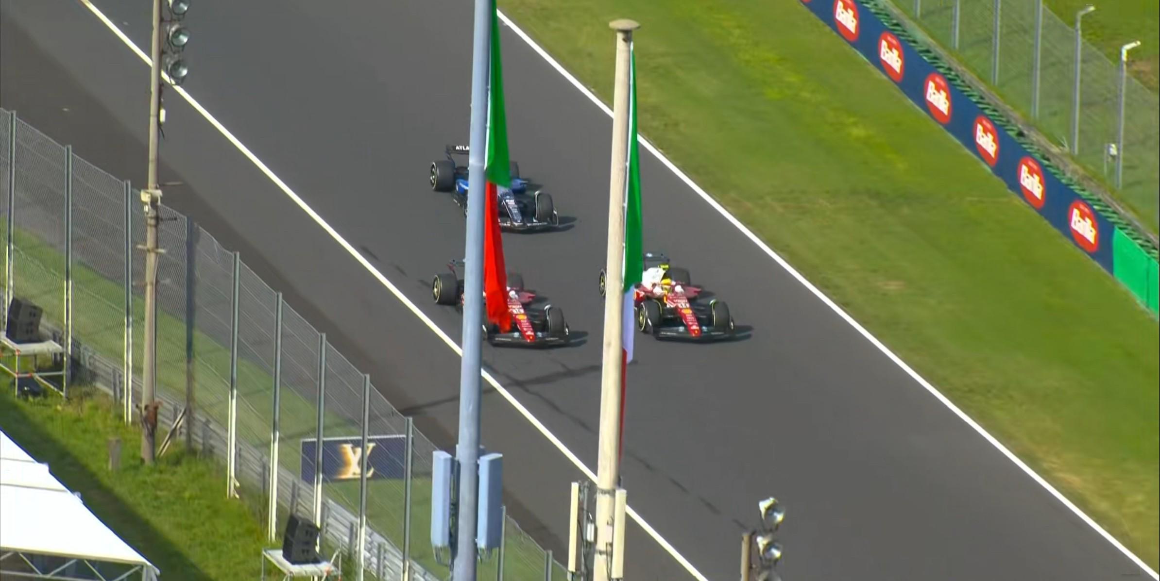 起步阶段:维斯塔潘在1号弯错过刹车点直接切过缓冲区,勒克莱尔向皮亚斯特里发起猛烈进攻;