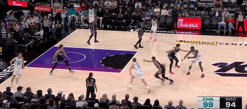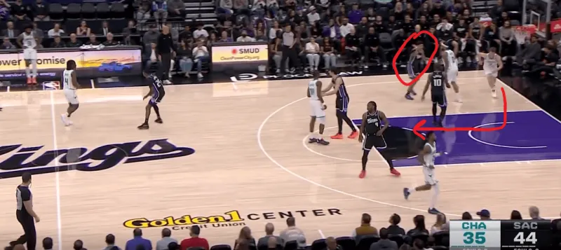 黄蜂阵地战的L系列跑位战术,克尼普尔从底角启动,先借布里奇斯掩护随后从中路走迪亚巴特掩护兜出,本质是gut stagger的起手,克利夫德示意德罗赞提前换防,