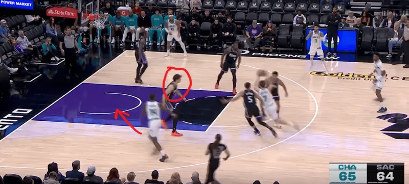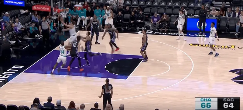 转换进攻的机会三球迅速交给前场迪亚巴特,随后后者和Kon在前场展开单侧的二人转掩护,克尼普尔利用雷诺忌惮迪亚巴特顺下果断快速收球完成突破终结: