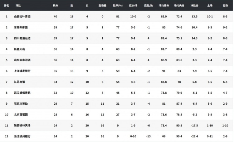 本赛季WCBA的A组战绩排名