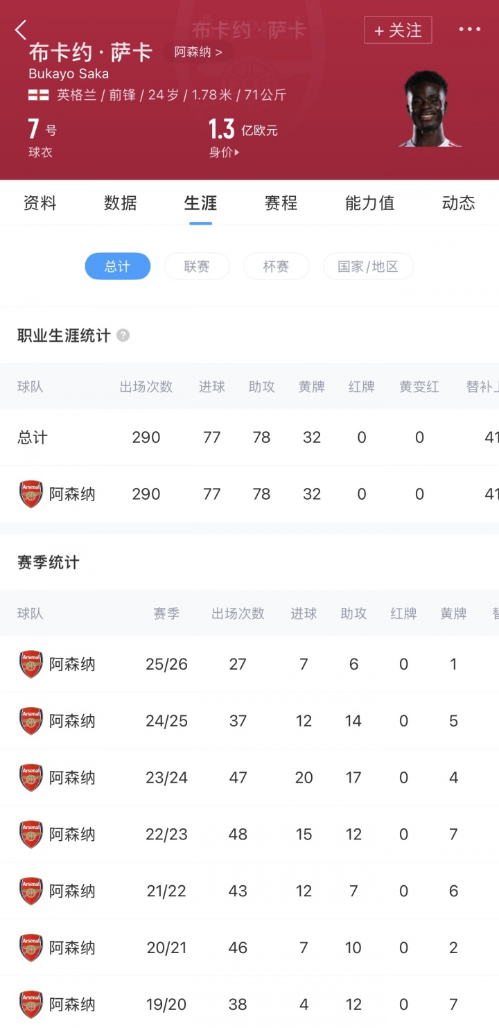 萨卡现年24岁,德转身价1.3亿欧。球员出自阿森纳青训,目前代表阿森纳出场290场,打进77球送出78助。